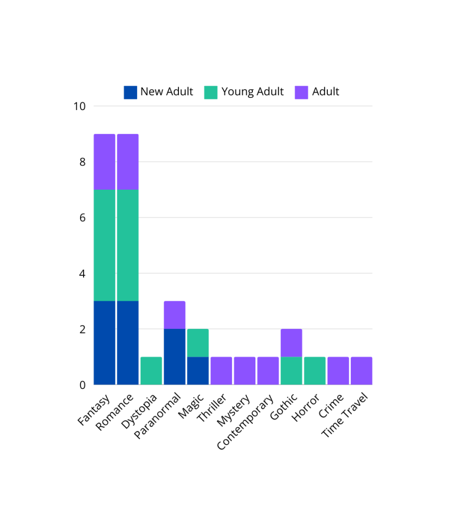 I am more surprised this month to see that Young Adult was the most read! That being said, I think that is because I reread Lightlark this month which gave YA an additional number. I’m still very much in my Fantasy and Romance era, but it’s fun to see some additional genres creeping in there!