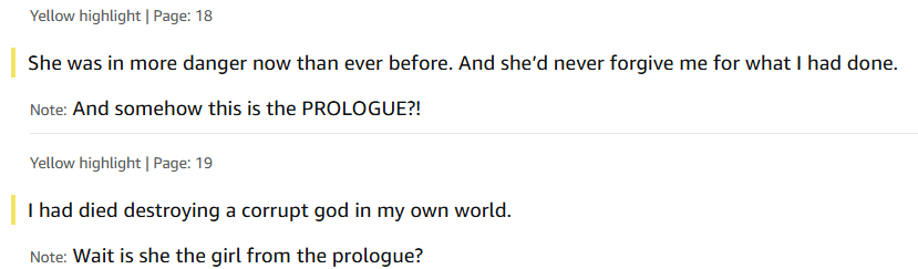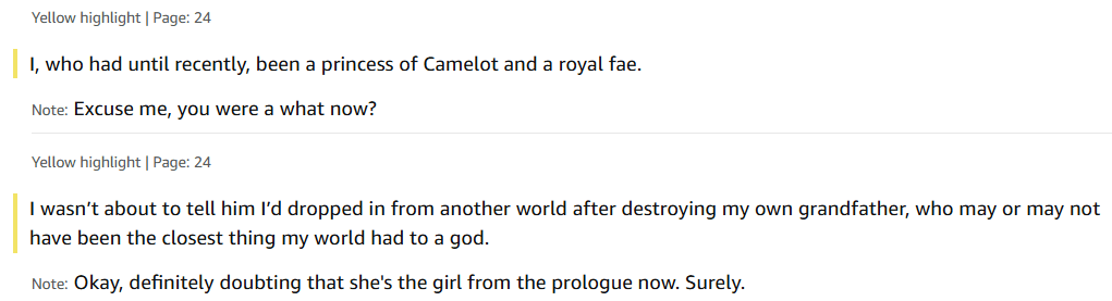 I, along side a lot of people in the book club, were somewhat confused by the sheer AMOUNT of things that were going on at the start of this book, and then again later when Medra was just seemingly never trying to get home (seemingly just accepting what she was experiencing as it for her). I mean you should see some of the notes I made in my kindle… wait, let me show you: